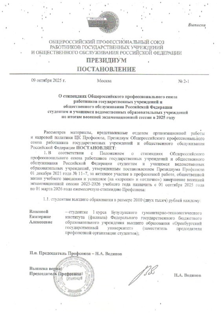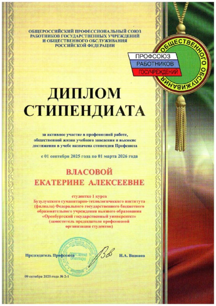В этом году достойной такой высокой оценки стала Екатерина Власова - студентка второго курса факультета экономики и права Бузулукского гуманитарно-технологического института (филиала) Оренбургского государственного университета, обучающаяся по направлению «Юриспруденция». Профсоюзная стипендия - это особая форма поощрения, доступная исключительно тем студентам, которые состоят в профсоюзной организации своего института. Такая выплата символизирует не только финансовую помощь, но и общественное признание активной жизненной позиции, лидерских качеств, инициативности, а также стабильно высоких академических результатов. Торжественное вручение стипендии состоялось в стенах института. Церемонию провела первый заместитель директора по учебной работе Надежда Викторовна Хомякова, которая тепло отметила заслуги Екатерины и подчеркнула важность её вклада в развитие студенческого самоуправления и профсоюзной активности. Екатерина Власова полностью соответствует этим критериям. Помимо отличной успеваемости, она активно участвует в жизни студенческого сообщества, занимая ответственную должность заместителя председателя Студенческого профсоюзного комитета. Её работа направлена на защиту прав студентов, организацию мероприятий, укрепление профсоюзной солидарности и развитие конструктивного диалога между обучающимися и администрацией вуза. «Для меня эта стипендия - не просто материальное поощрение, а мощный стимул к дальнейшему росту и самореализации, - делится Екатерина. - Очень приятно осознавать, что мои усилия замечены и ценятся. Благодарю профсоюз за эту возможность и поддержку». Получение профсоюзной стипендии - это яркое подтверждение того, что трудолюбие, инициативность и активная гражданская позиция всегда находят отклик и заслуженное признание. Екатерина Власова своим примером демонстрирует, как можно успешно сочетать учёбу, общественную деятельность и личное развитие. От всей души поздравляем Екатерину с этим значимым достижением! Желаем ей неиссякаемой энергии, вдохновения, новых профессиональных и личных побед, а также неизменной веры в свои силы и цели! Отдел по внеучебной работе