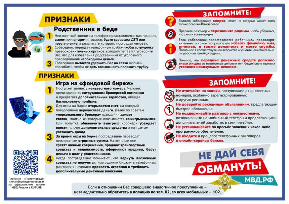 Министерство внутренних дел Российской Федерации разработало памятки для повышения уровня информированности населения о действиях лиц, вводящих в заблуждение в целях хищения денежных средств.