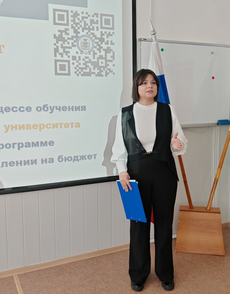 Во время встречи с обучающимися начальник отдела по работе с абитуриентами и продвижению образовательных программ Глазина А. В. рассказала о подробностях приемной кампании, нововведениях в правила приема, льготах и скидках для студентов очной формы обучения, и возможностях поступления на бюджет. Специально для юношей, выпускников 11-го класса, сообщила информацию о возможности зачисления в военный учебный центр для обучения по программе военной подготовки параллельно с обучением по основной образовательной программе. Декан строительно-технологического факультета, доцент кафедры финансов и кредита, кандидат экономических наук Завьялова И.В и декан факультета экономики и права, доцент кафедры педагогического образования, кандидат педагогических наук Григорьева О.Н.. поделились тонкостями учебного процесса на факультете, перспективными направлениями подготовки, трудоустройством выпускников и активной жизнью студентов в институте. Ольга Николаевна обратила внимание выпускников на то, что высшее образование - это уникальная среда общения, где формируются профессиональные связи, появляются друзья и единомышленники, высшее образование - это не просто "корочка", а фундаментальная база для будущего. Инна Валерьевна подчеркнула важность получения высшего образования и его влияние на карьерные перспективы, отметив, что образование открывает двери к новым возможностям, способствует развитию профессиональных навыков и формирует конкурентоспособность на рынке труда. Выбор высшего учебного заведения — это, пожалуй, один из самых важных и сложных этапов в жизни, который во многом определяет траекторию вашего будущего! Отдел по работе с абитуриентами и продвижению образовательных программ