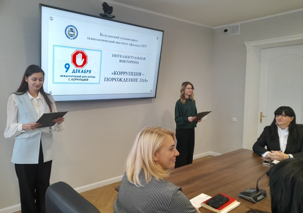 9 декабря в администрации города Бузулука состоялся семинар для муниципальных служащих, посвященный Международному дню борьбы с коррупцией. В рамках этого значимого мероприятия студенты направления подготовки Юриспруденция Бузулукского гуманитарно-технологического института (филиала) ОГУ под руководством старших преподавателей кафедры юриспруденции Унгурян Ю.Л. и Баскаковой Н.П. провели интеллектуально-развлекательную викторину «Коррупция – порождение зла».